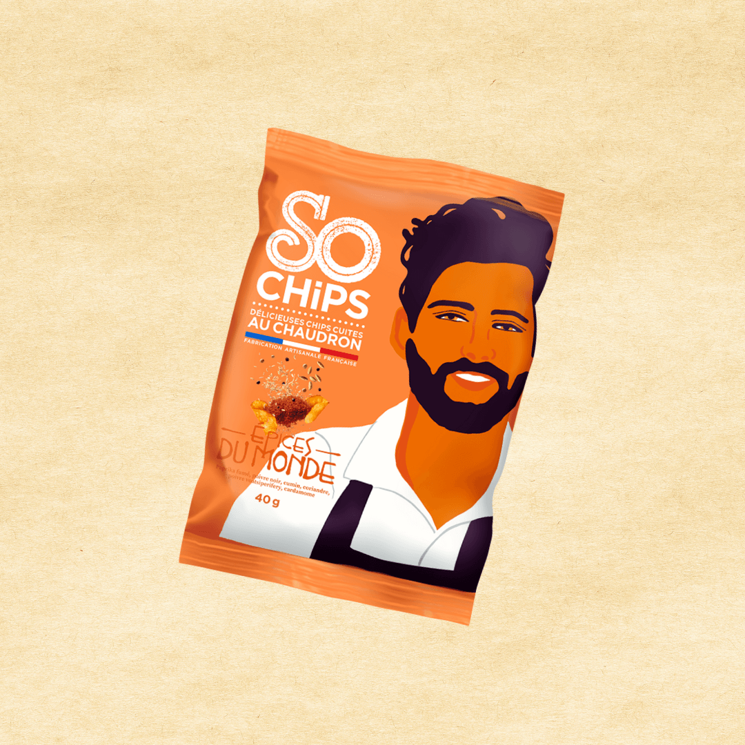 Des pommes de terre SO locales sélectionnées par le chef, issues d’une agriculture éco-responsable. La tranche épaisse est leeennnnntement cuite dans un chaudron pour offrir le meilleur de la pomme de terre : son goût et sa texture sont au top ! Les épices savamment choisies chez des producteurs aux 4 coins du monde sont une véritable explosion de saveurs : paprika fumé, poivre noir, poivre voatsiperifery, cumin, coriandre, cardamome : la SO CHiPS Épices du monde est une invitation éthique et authentique aux voyages, let's GO !